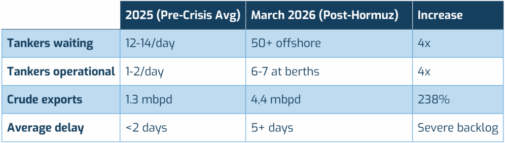 Pre-crisis levels saw around 12 to 14 tankers waiting offshore and just 1 to 2 loading daily. By late March, more than 50 tankers were waiting, with 6 to 7 loading simultaneously.